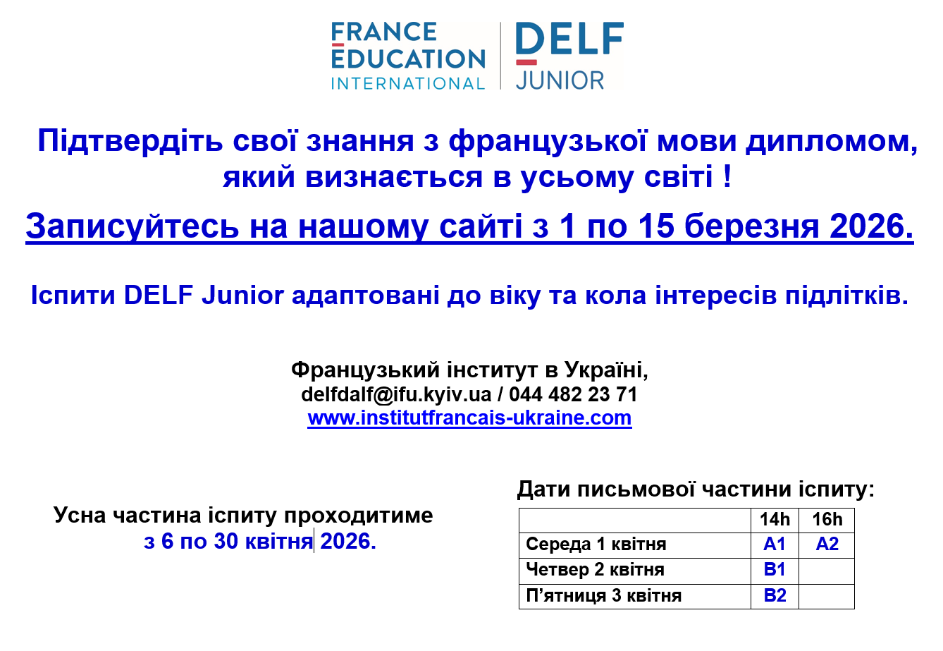 З 1 по 15 березня триватиме запис на іспити DELF Junior які проходитимуть у квітні 2026 року.
